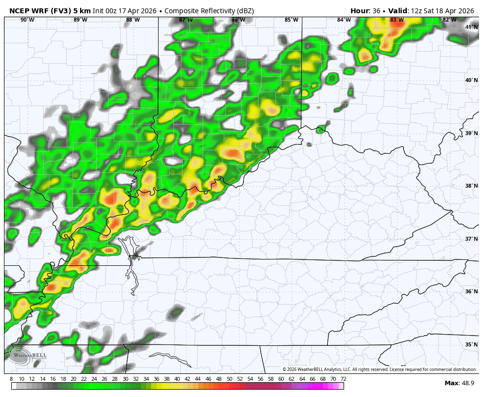 A potent cold front sweeps across the state from west to east on Saturday. Showers and storms will roll along and ahead of this boundary through the wee hours of Sunday morning before exiting eastern Kentucky. You can see all this from the future radar of the WRF…