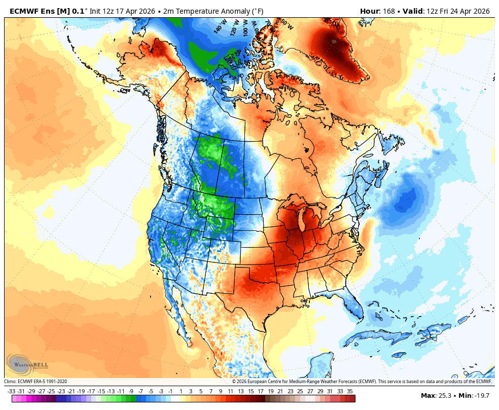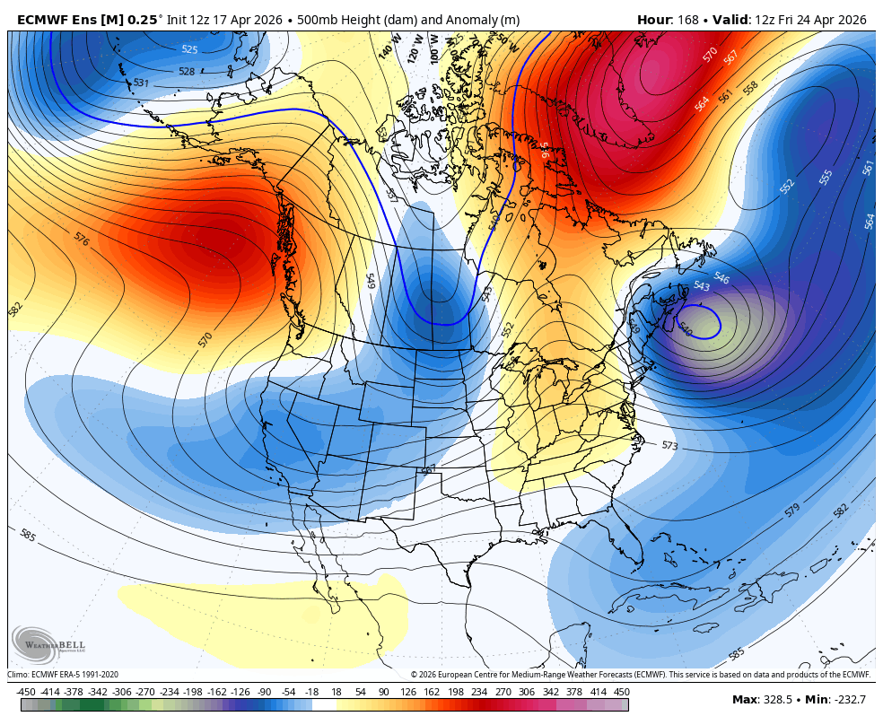 Temps surge back toward the 70s by Tuesday and may hit the 80s later next week before large scale hemispheric pattern changes show up in the closing days of April and early May. Watch how a trough looks to get established across the eastern half of the country during this time…