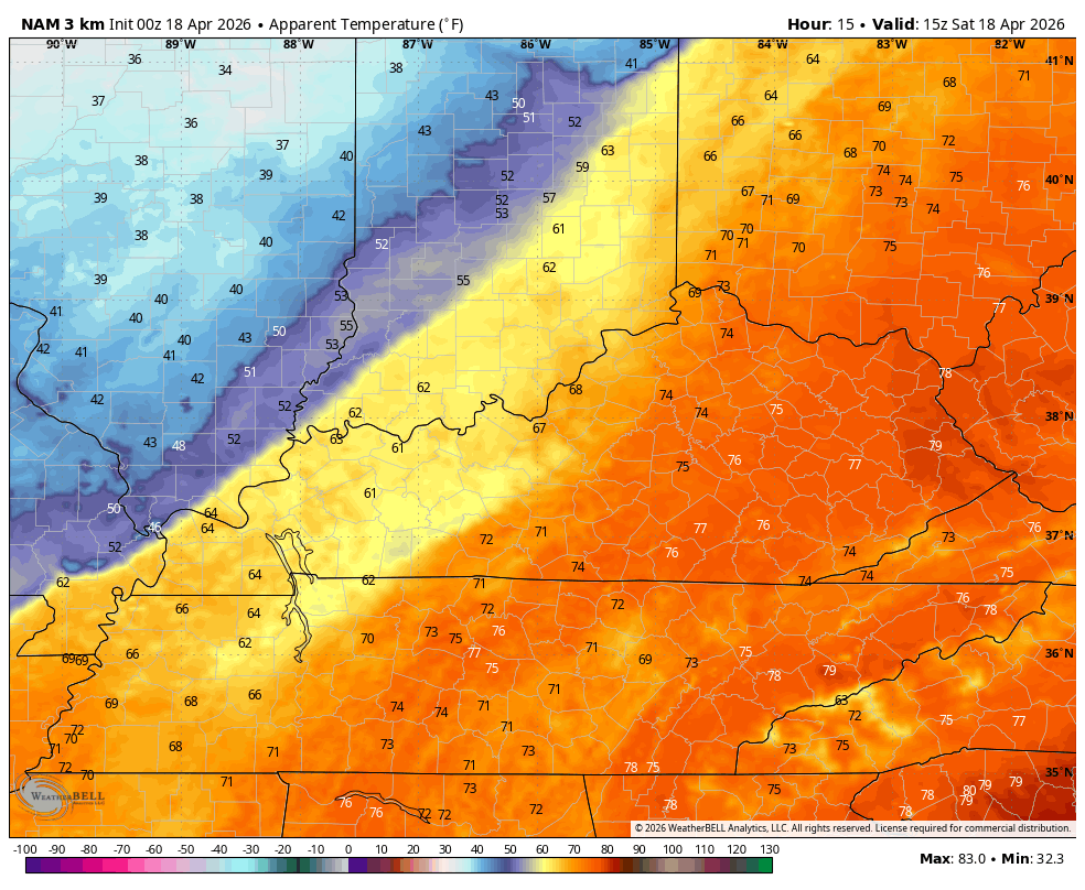 Temps will tank from west to east throughout the day. Eastern Kentucky hits the 80s at the same time areas of the west and north are dropping through the 50s. Check out the feels like temperature plunge from midday today through 7am Sunday…