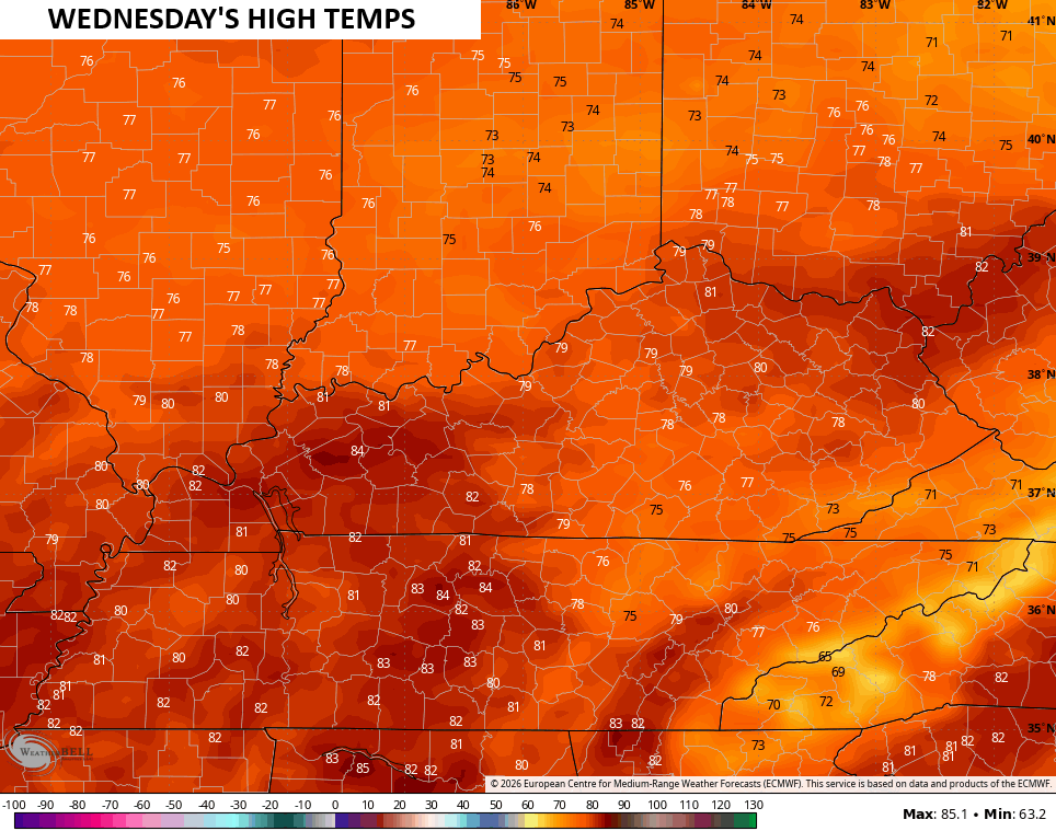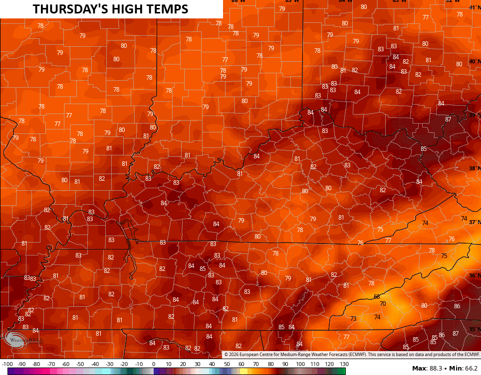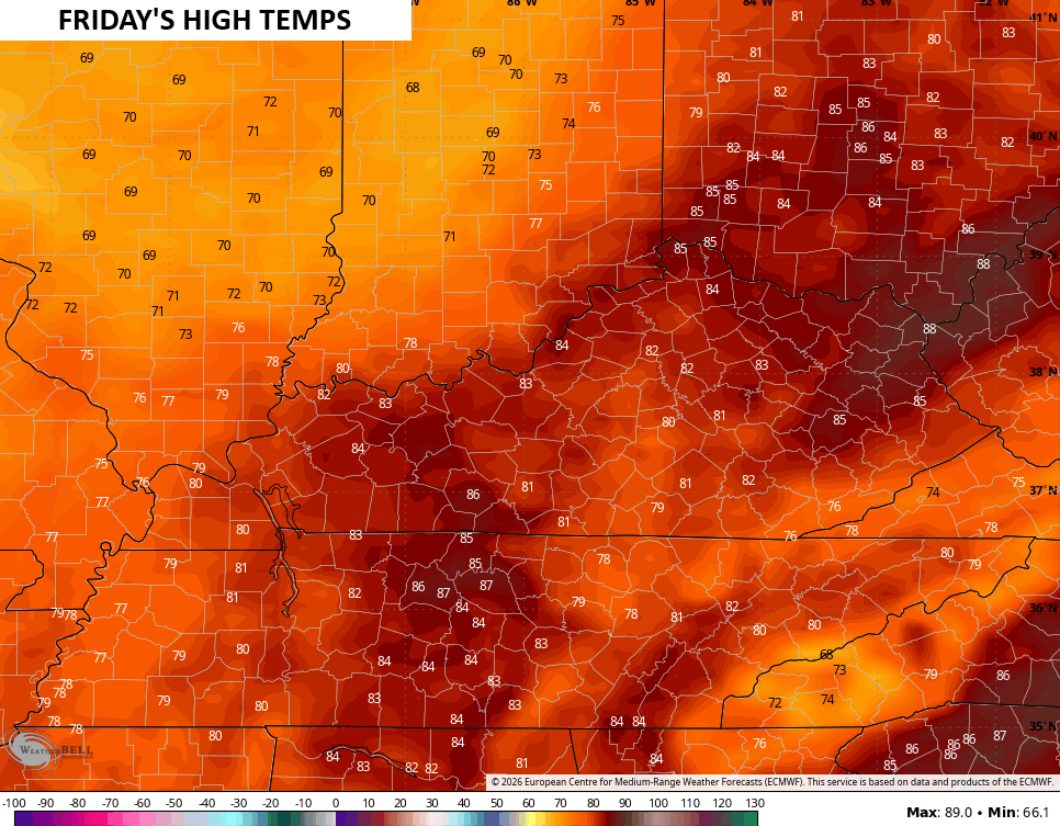 From there, we see the 80s creeping back in from Wednesday through Friday. Look at the daily high temps from the EURO…