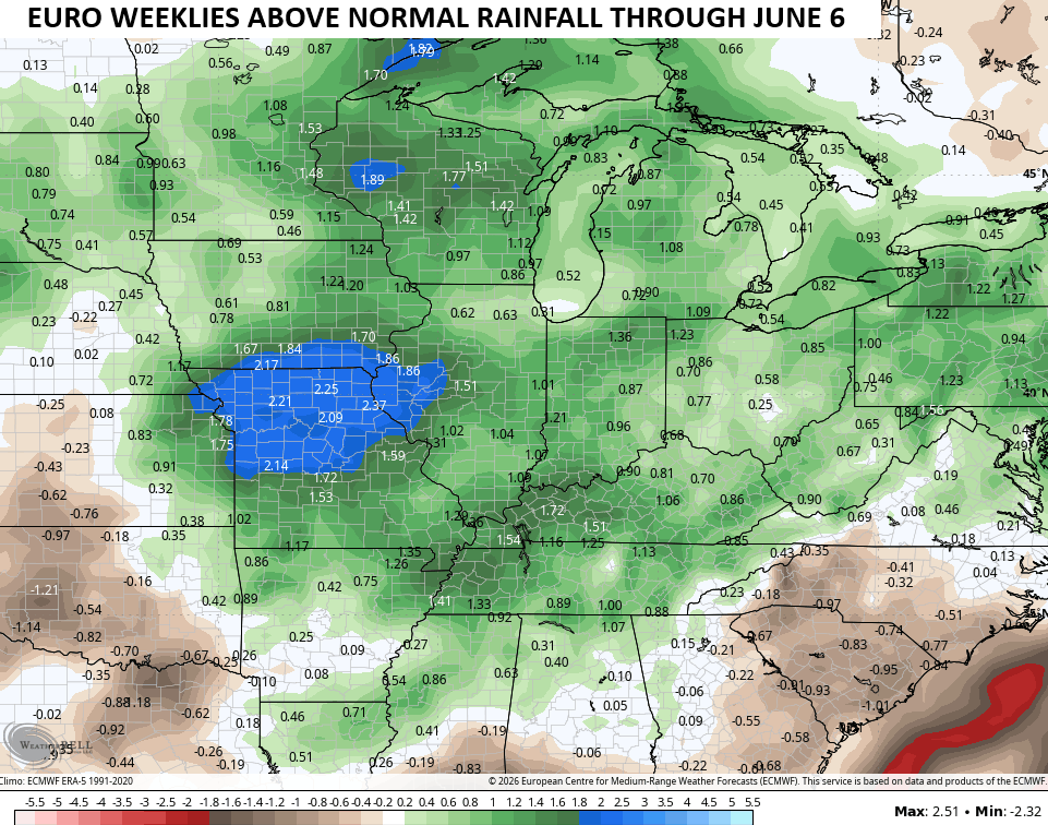 It is interesting to note the EURO Weeklies are all in on a pattern change to above normal rainfall through early June…