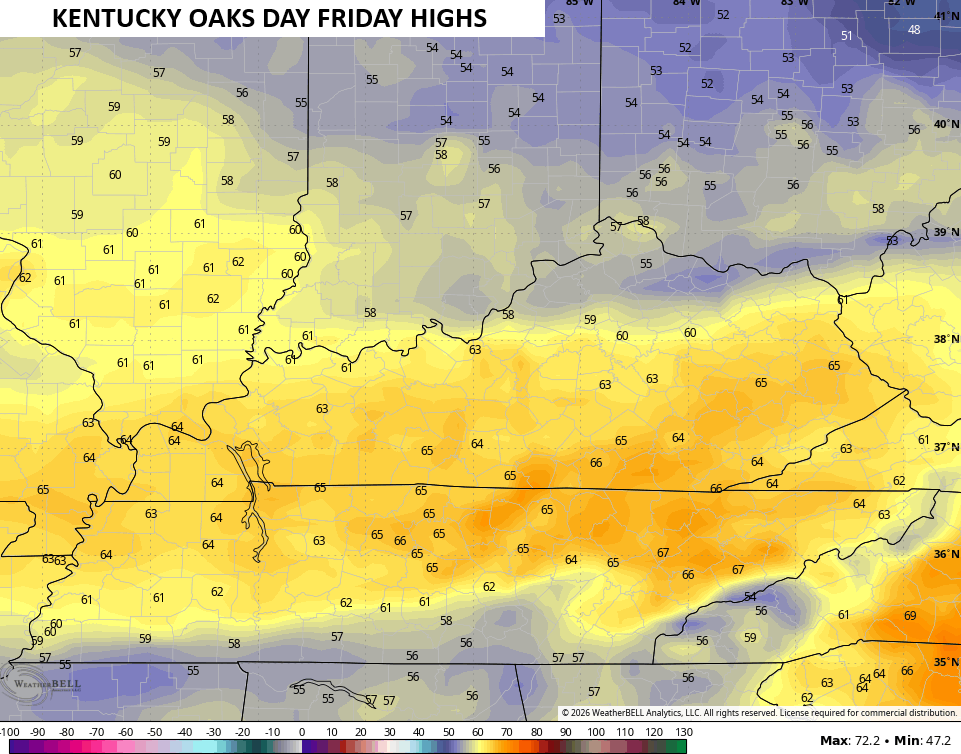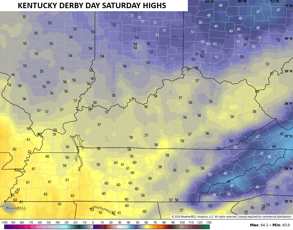 Kentucky Derby Saturday will be among the chillier ones we’ve had with highs that may not get out of the 50s…
