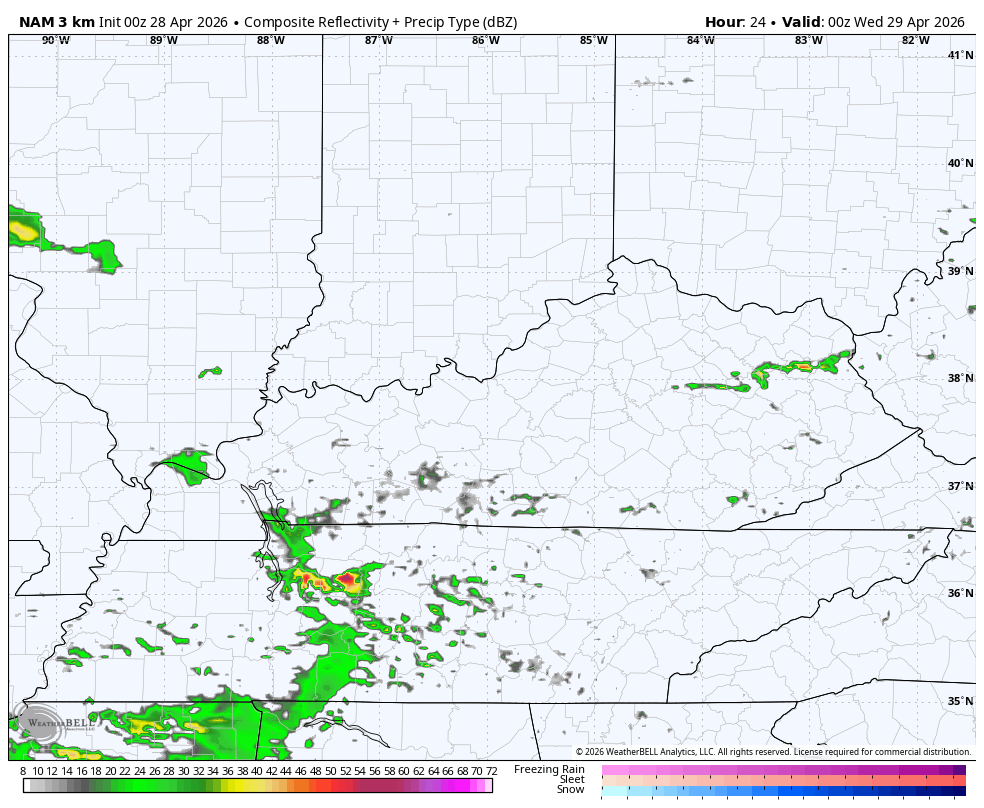 The future radar from the Hi Res NAM shows all this from 8pm this evening through 8pm Wednesday…
