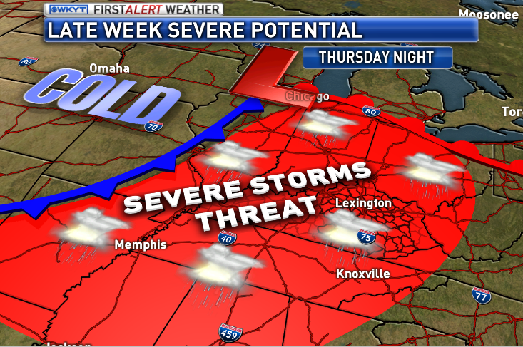 Thursday is when we have to keep a close eye on the evolution of a storm system in the plains. That will deepen and work toward the Great Lakes. Ahead of it, temps will surge into 60s on a gusty southwesterly wind that may top 35mph at times. Instability will increase throughout the day and that may help get a potent line of storms to develop to our west. That line would come racing eastward late in the day into Thursday night.
