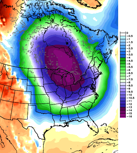 On a different note… winter is coming back and may come back in a big way. How about a late February and early March version of the Polar Vortex? That is being suggested by most of the medium range models and would mean a prolonged period of much colder than normal weather around here. Look at a 5 day average temperature departure in Celsius…