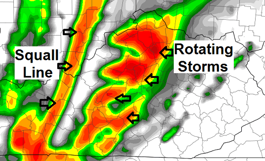 A squall line of thunderstorms will likely develop across western Kentucky and roll eastward during the evening hours. We will need to keep a close eye on the possibility of a few storms going up ahead of this line. That’s something the latest Hi-Res NAM simulated radar is showing tomorrow evening…