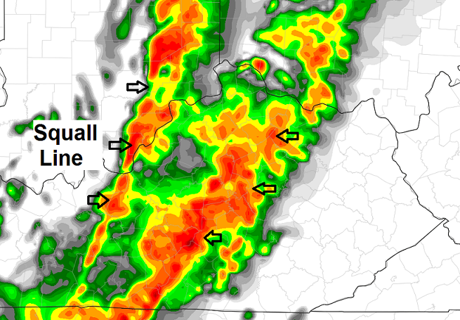 – A line of thunderstorms will get going this afternoon in western Kentucky and that rolls eastward this evening and overnight. Damaging winds will be very possible with this line as it sweeps in.