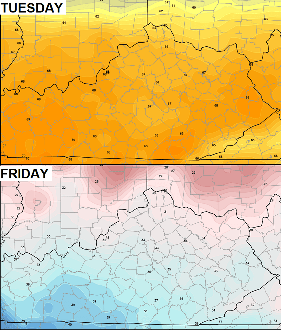 The temps will really bounce back early next week and will likely head into the 60s and could touch 70 degrees! While that is great and all, those numbers are likely to tank by the end of next week. Check out the nose dive from the European Model…
