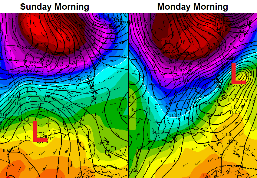 30s will be with us Tomorrow with a nice rebound close to 60 for Friday. That’s when we start to go the other way. A cold front sweeps in late Saturday with a shower chance and temps in the 50s. This front pushes through on Sunday as low pressure develops across the deep south and works toward the Carolinas…