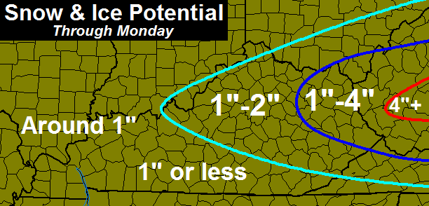 Latest RAP model shows axis of heaviest snow across eastern KY along and north of I-64. Already reports exceeding 2″. Another couple of inches likely. Ashland, Greenup, Mavity, Drift and nearby areas appear to be the most likely winners with the snow amounts.