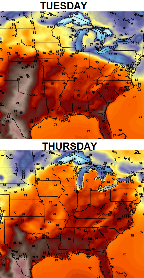 This leads us into a super warm pattern with temperatures going well above normal. Highs much of next week should be in the 80s. Check out the blast of heat pushing all this in the plains states…
